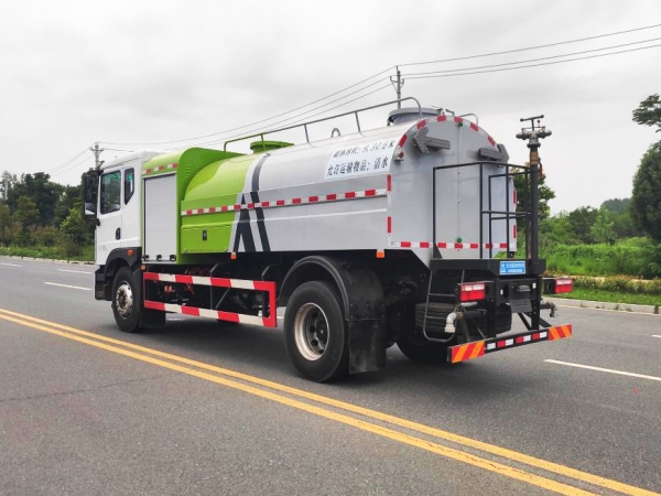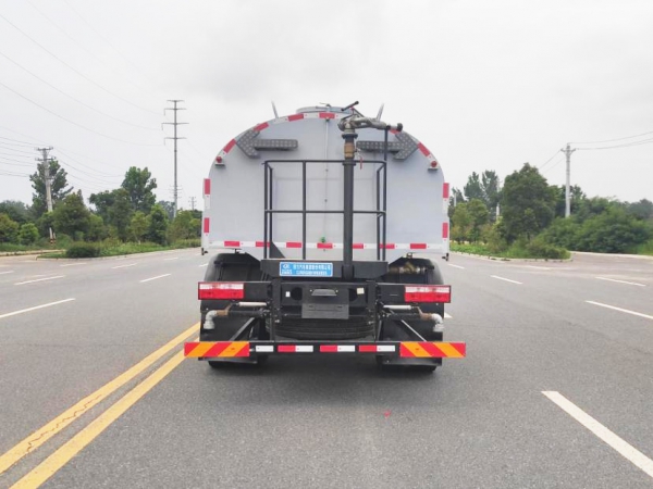 上裝容積 11 立方,罐體采用 Q235 優(yōu)質(zhì)碳鋼材質(zhì),鋁合金后平臺、鋁合金側(cè)防護,60-90 灑水水泵,全自動前沖、后灑、高炮,可在駕駛室一鍵操作灑水功能。高炮射程可達 35 米以上。